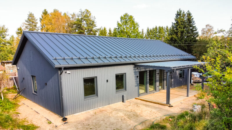 Одноэтажный каркасный дом в Ленинградской области с консольной крышей террас и штукатурными фасадами